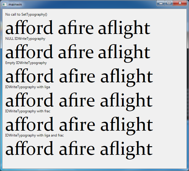 在Core Text和Pango上,如果我启用其他属性,它们将被添加到这些缺省值之上。但是使用DirectWrite,特别是IDWriteTextLayout::SetTypography(),这样做可以消除缺省值。