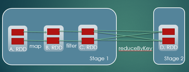 这里的rdd行有两个分区。在上面的图表中,假设A、B、C和D是这样的,red每个有2个分区(红色方框)。如图中所示,每个rdd都是转换的结果。基本上,rdds之间的依赖被划分为窄依赖和宽依赖。仅由子rdd的一个分区使用父rdd的每个分区,而数据的洗牌导致广泛的依赖关系,就形成了狭窄的依赖关系。