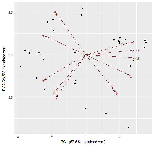 ggbiplot(mtcars.pca, obs.scale=1, var.scale=1, ellipse=F, circle=F,labels.size = 4)