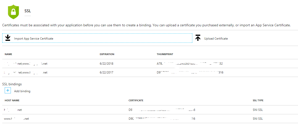 是的,如果要更新SSL证书,则必须在SSL绑定中手动更新绑定,但是如果您的SSL已经基于IP,则不必再次设置IP绑定。您还应该参考此https://riccardo-moschetti.org/2016/02/07/renewing-an-ssl-certificate-for-a-website-hosted-in-azure/,以便逐步获得图像信息。