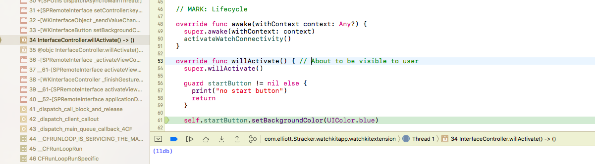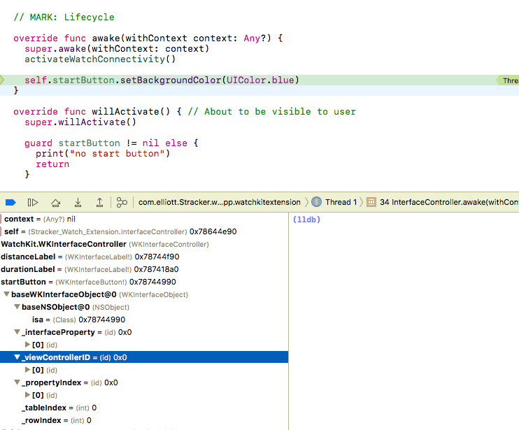 @IBOutlet fileprivate weak var myButton : WKInterfaceButton!检查你的插座是否连接。