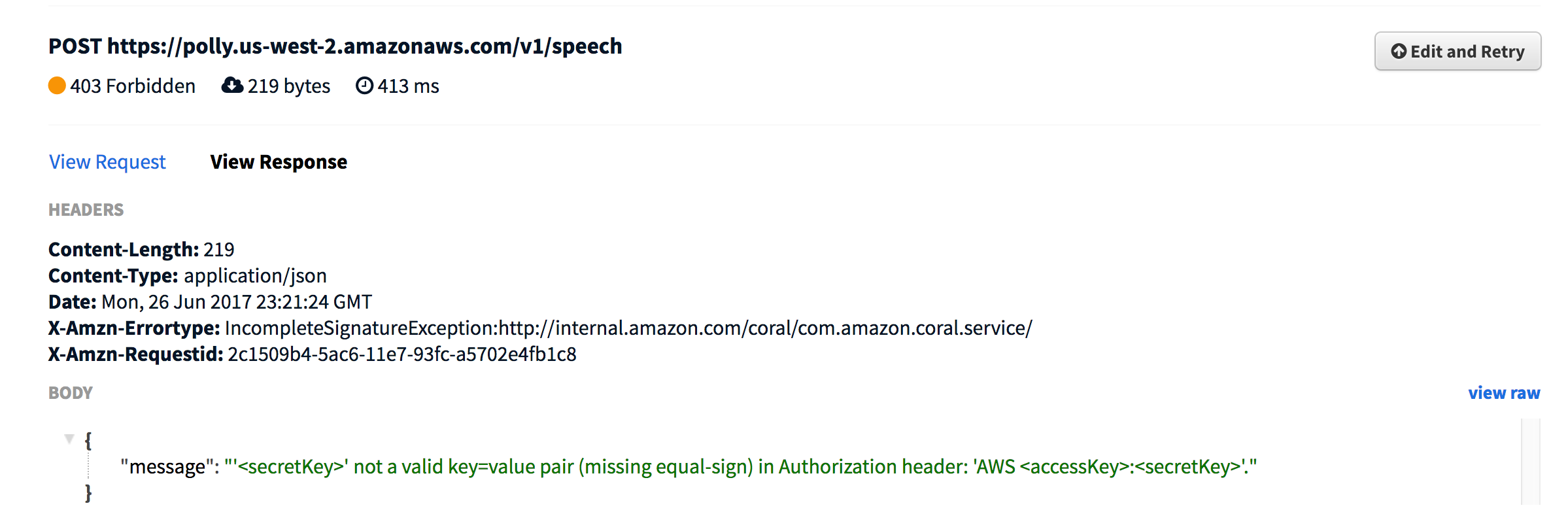 method=POST,host=polly.us-west-2.amazonaws.com,endpoint=https://polly.us-west-2.amazonaws.com/v1/speech,region=us-west-2,content-type=application/json,body of post request={...},accessKey=...,secretKey=...以及如何使用OkHttp发出此请求?求你了救命!发布于 2017-06-27 00:39:16