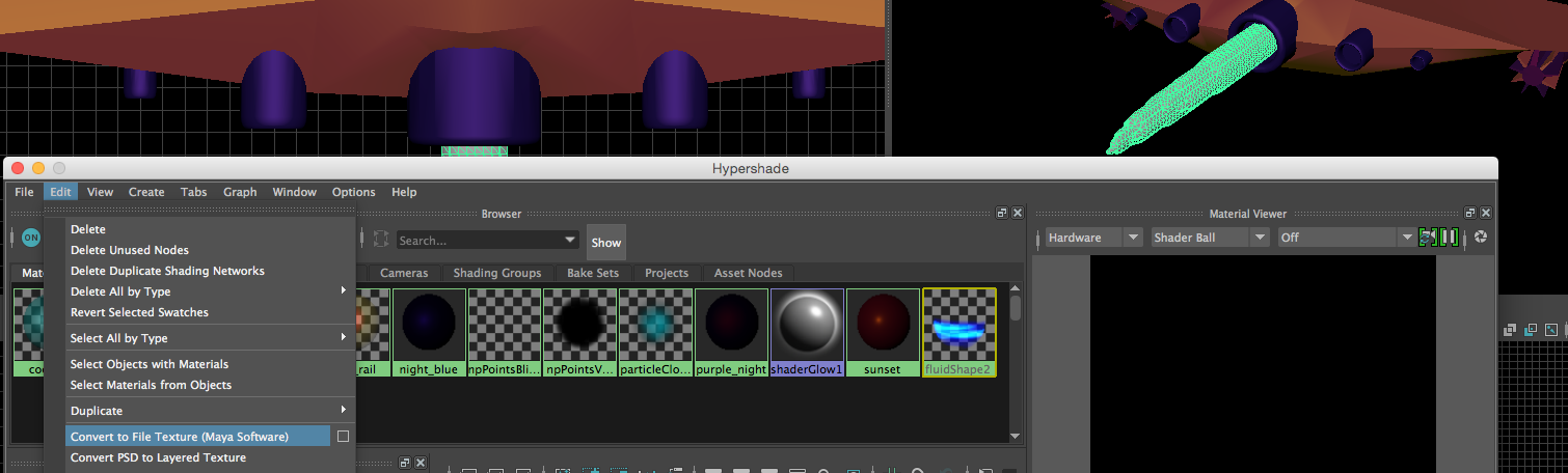 步骤3:选择生成的几何从流体到多边形步骤,选择我的fluidShape2在超高速和执行超高速编辑>转换为文件纹理(玛雅软件)(不工作,得到一个错误)