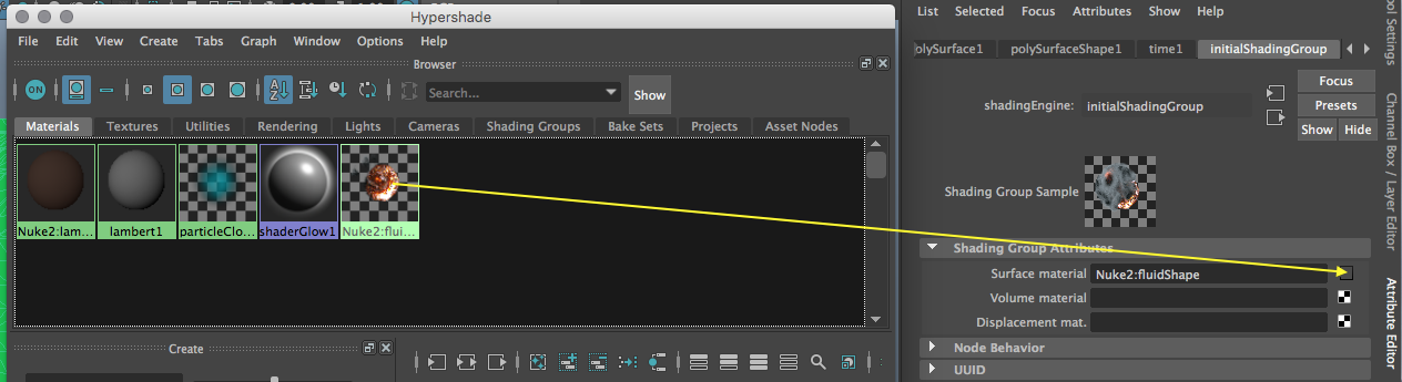 当转换完成时,默认玛雅着色器(Lambert1)被分配给新的多边形网格。你必须重新分配你的流体纹理到新的多边形网格。为此,打开超高速和MMB-拖降流体织构的表面材料槽的多目网眼.