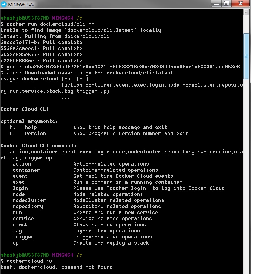 运行的第一个命令是运行一个确实运行docker的Docker容器。运行这个容器也不是直接将docker命令安装到windows主机上的一种方式。您可以始终调用相同的'docker运行dockercloud/ CLI‘命令来运行CLI容器化。