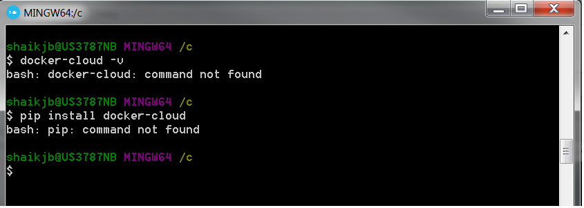 我是新的对接和设置环境在我的windows 7笔记本电脑开始学习。我是通过码头工具箱安装的。为了安装docker cloud cli,我遵循了官方文档