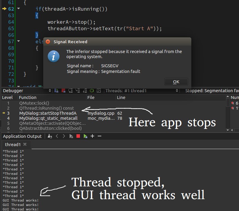 我编写了用于测试线程工作方式的小应用程序。我有两个按钮的简单GUI界面。每个线程都可以启动和停止不同的线程。线程基于Worker类在此链接下。我正在用Qt Creator在Ubuntu16.04LTS x64下编译我的代码。