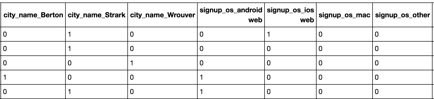 df_with_dummies = pd.get_dummies(df2, columns = col_names)虚拟编码根据每个列的因素数创建新列,然后用0和1替换值:
