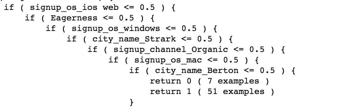signup_os_ios_web <= 0.5,因此等于0),那么它将继续到它的子节点,特别是Eagerness;signup_os_windows二进制虚拟.诸若此类。将0.5看作是和1之间的一个简单的中等阈值或中心,它基本上将“是”和“否”划分为两种可能甚至发生的情况。