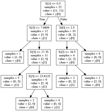好的,在我们安装了DT分类器之后,我们可以用它创建一个图表来更彻底地查看树结构(我使用了export_graphviz来实现这一点):