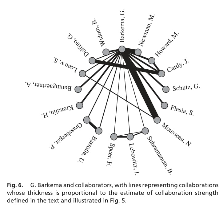 我会在这些标志性的网络图中看到这一点,但强调不同的团队(公司)之间的关系的强度。在我看来,一个相关的例子是Mark在“http://www.pnas.org/content/101/suppl_1/5200.full”(Newman 2004)中的合著研究(图6)。图6中的每一对节点(即作者)由不同厚度的边缘连接,表示每一对作者之间的合作强度强度(即两作者之间的协作作品数),如下图所示: