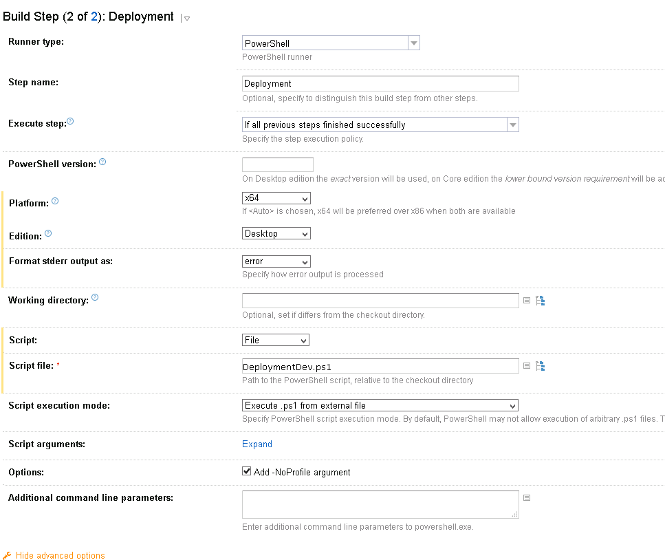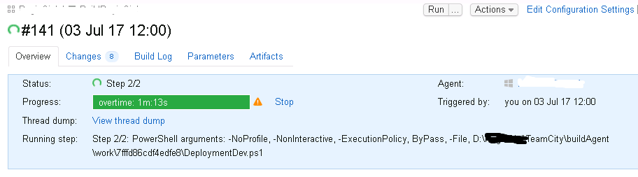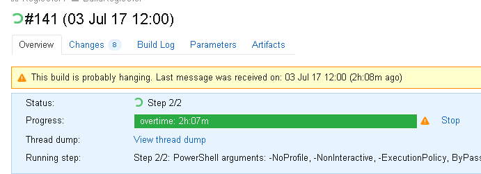 在构建步骤中,我有一个执行powershell文件的步骤。但我得加班我不知道为什么..。