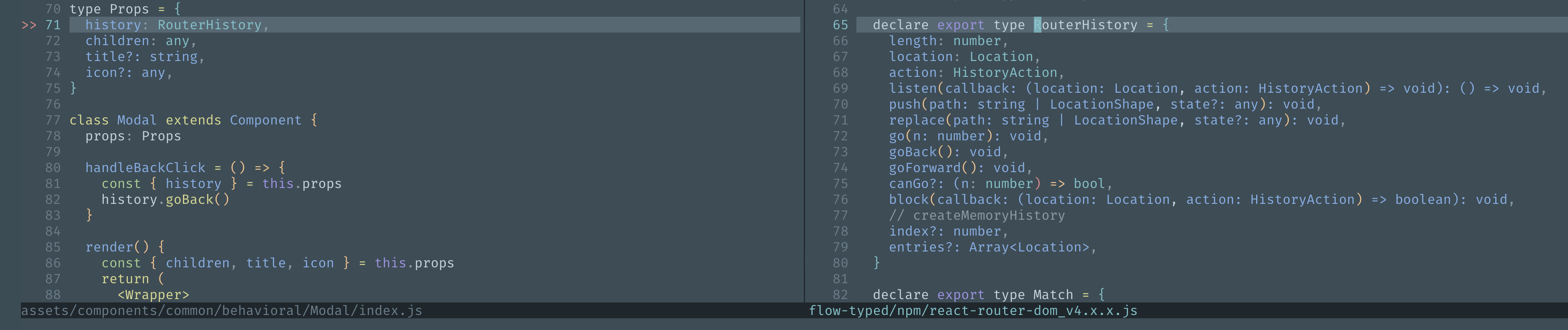 但是这会导致一个RouterHistory not found in 'react-router-dom'错误,即使在上面的截图中可以看到它存在于来自flow-typed/npm/的react-router-dom_v4.x.x.js libdef中;我认为只有当npm库中包含*.js.flow文件时,类型的显式导入才能工作( react-router-dom没有这样做,而是在flow-typed中定义)。