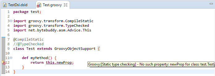 经常使用used来填补静态类型检查器和程序的动态执行状态之间的空白。如果您想要与@TypeChecked或@CompileStatic兼容的东西,您可能需要编写一个TypeChekingExtension,而不是DSLD贡献。