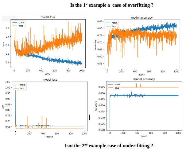 对我来说,第二个例子是under-fitting:这个模型没有足够的学习能力。而第一例有over-fitting的问题,因为它的训练没有停止时,过度适应开始(early stopping)。如果在100年代停止训练,这将是一个更好的模式之间的两个。