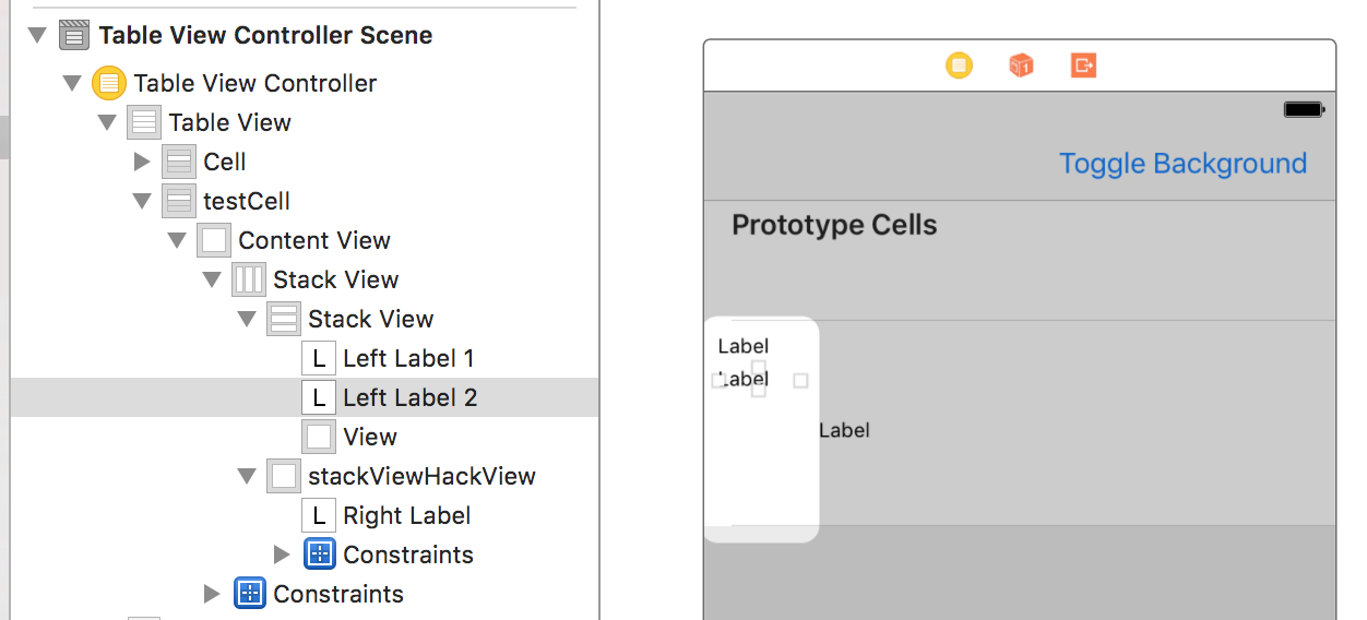 右标签被固定在其父stackViewHackView的尾随、前导、底部和顶部边缘上。