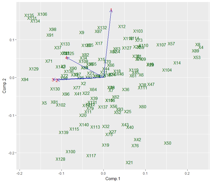 我使用princomp函数和ggfortify包对R做了PCA。我无法确定第四个部分的所有观测结果(其中有一个X25和2-4个其他观测)。有什么办法能让我更顺利地把他们区分开来吗?我不在乎使用什么软件包,我只想看看观察结果要好得多。