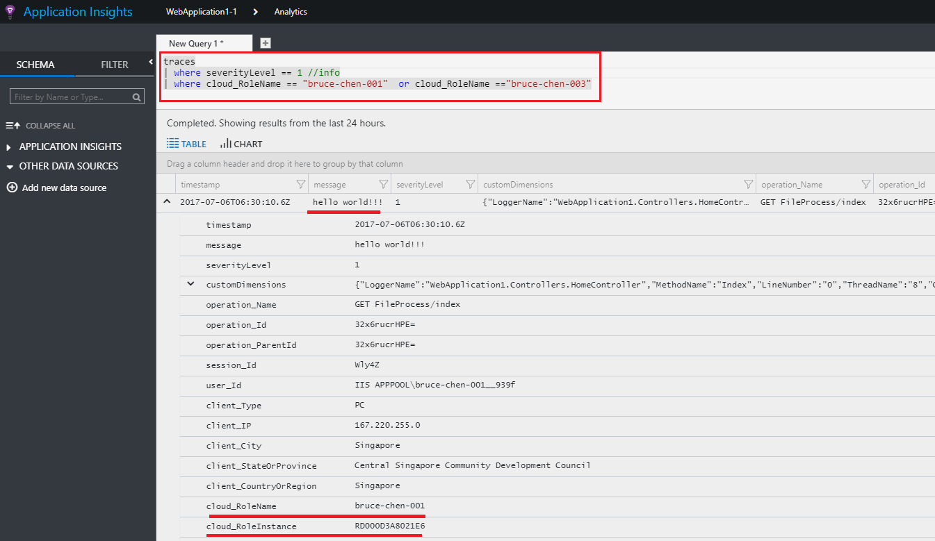 您可以利用应用洞察中的分析并编写查询,以便根据筛选器区分日志和不同的服务,如下所示: