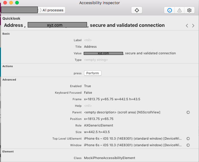 Button 0x600000168100: traits: 146028888065, {{66.5, 24.5}, {299.0, 29.0}}, identifier: 'URL', label: 'Address', value: google.com