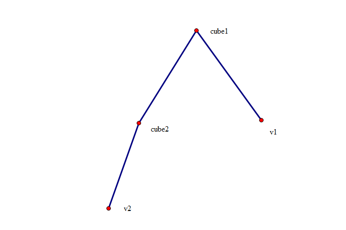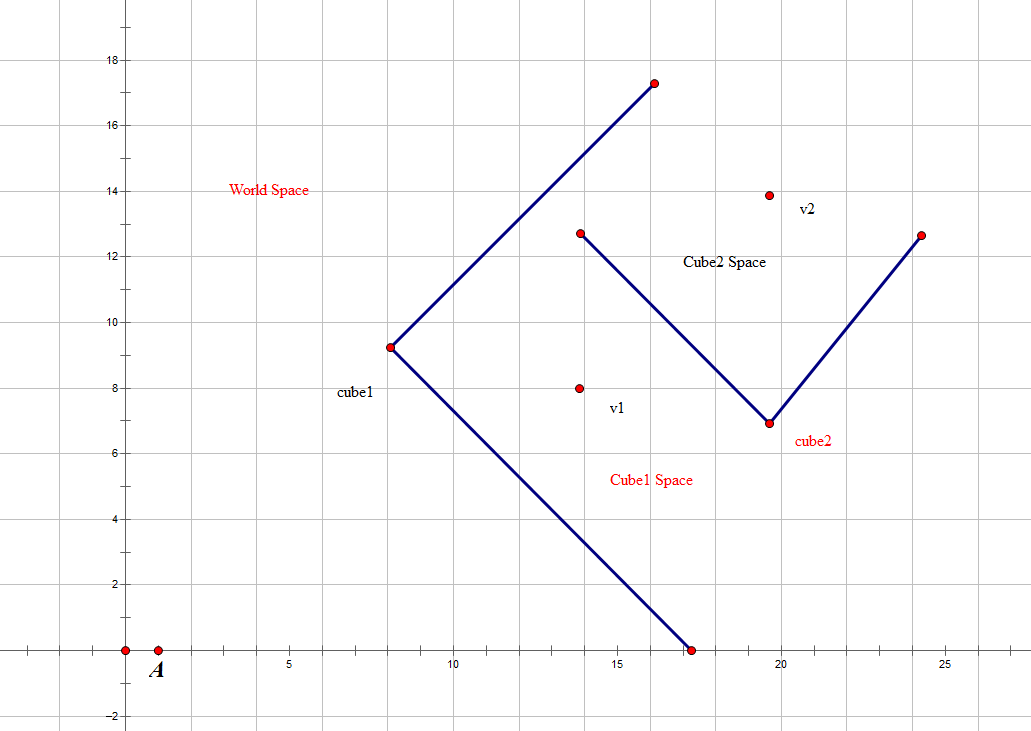 因为v2是cube2的孩子,所以我们需要移动cube2。在世界空间中,我们应该将cube2从v2到v1的一段距离转换,现在我们得到cube2的世界位置,cube2是cube1的一个子项,只需应用cube1的逆矩阵就可以得到cube2的局部位置。