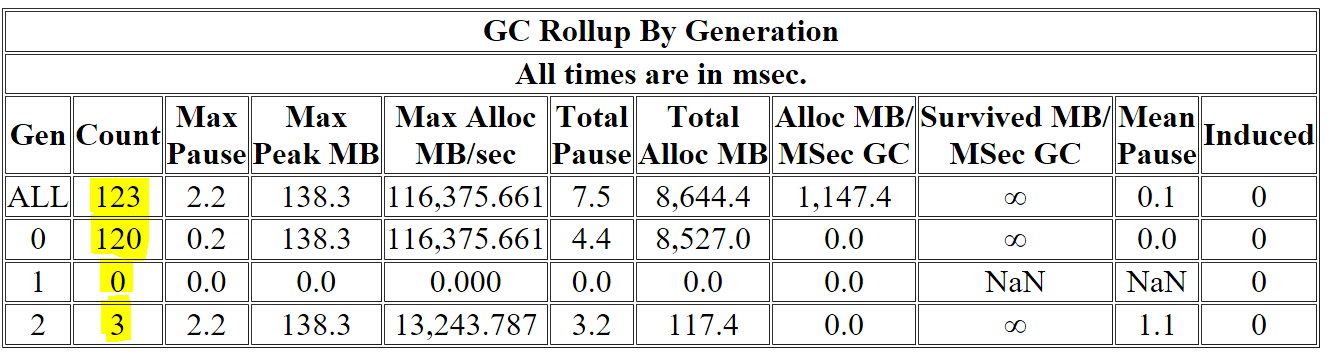 报告中的主要区别是,GCReport显示每个确切生成的数量,而GC.CollectionCount显示特定世代或更高的GC数量。因此,GC.CollectionCount(0)是所有GCS (即Gen0,或Gen1或Gen2),并注意到他们在上面达成了一致。