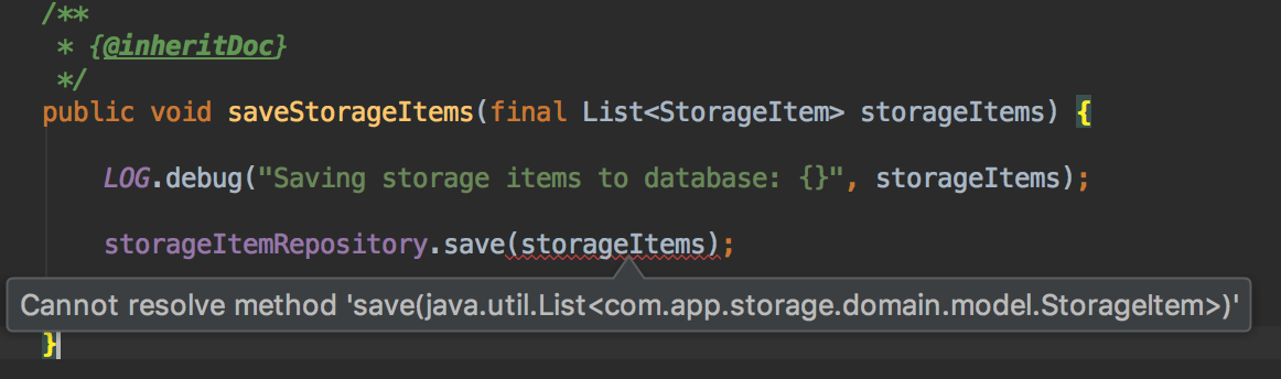 您正在扩展CrudRepository<StorageItemPersistenceModel, Long>,但正在尝试保存List<StorageItem>,因此错误没有找到save(List<StorageItem>)。