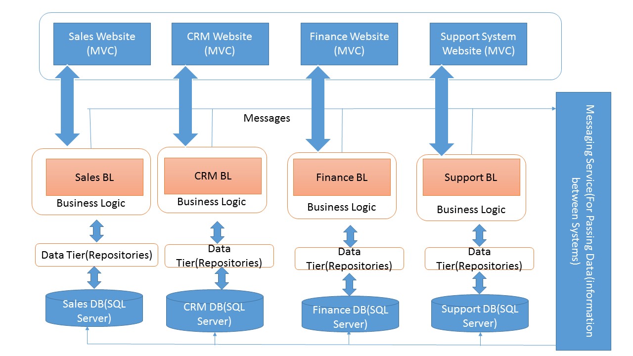 相反,我更喜欢下面的体系结构,它是一种微服务架构,其中每个应用程序使用通用存储库和EF将数据写入其数据库,当应用程序希望彼此对话时(即插入/更新/获取数据),则使用消息传递服务。请告诉我哪种方法更好。