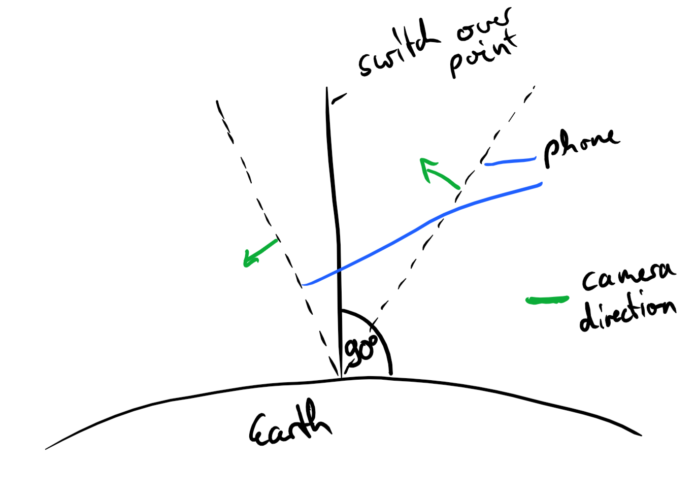 改为步骤(3)。你现在向后倾斜你的手机。一旦切换点来,那里的相机不再面对地面,但现在天空和屏幕正面临略微向下,所有三个数值都有很大的变化。俯仰将跳跃约-180°,滚动将额外跳约90°,你实际改变的数量,而偏航将跳跃约+180°。