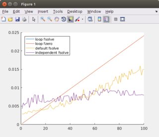 plot(ns, loopFSolve(f, ns, options), 'DisplayName', 'loop fsolve')