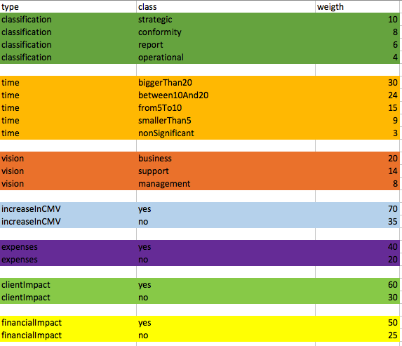我正试图建立一个风险计算矩阵。因此,当风险被识别时,这种风险对于每种类型都有一个类别。有7种不同的类型和20个不同的类,如图所示: