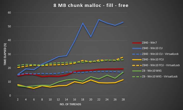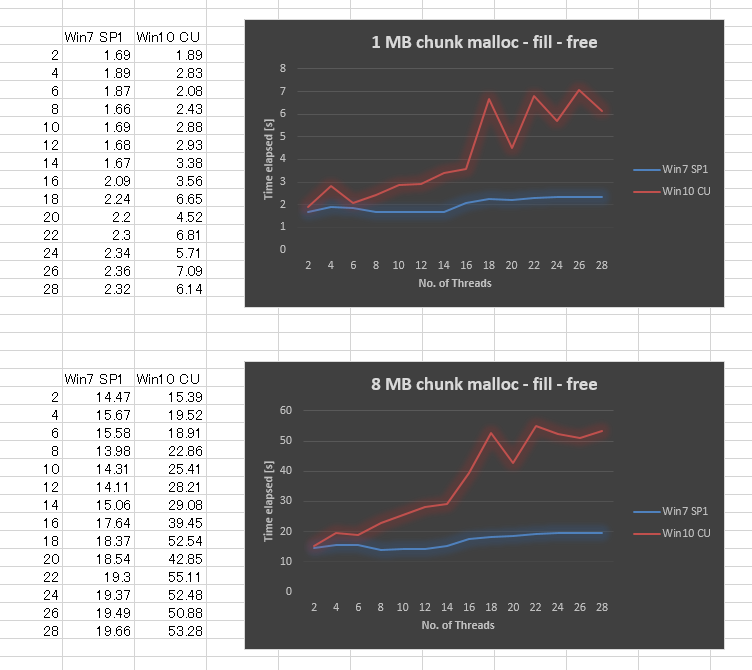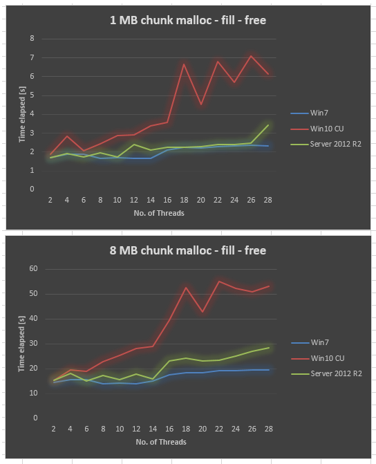 }令人惊讶的是,与Windows 7相比,Windows 10 CU中的结果非常糟糕。我为1MB的块大小和8MB的块大小绘制了下面的结果,将线程数量从2,4,.变化到28。当我们增加线程数时,Windows 7的性能略差一些,而Windows 10的可伸缩性则差得多。