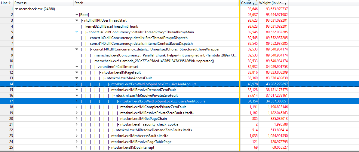 使用https://github.com/google/UIforETW (感谢Bruce )来分析基准测试,我们发现大部分时间都花在内核KiPageFault中。深入挖掘调用树,所有这些都会导致ExpWaitForSpinLockExclusiveAndAcquire。似乎锁争用导致了这个问题。