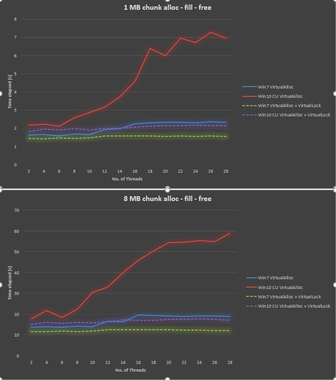 使用@Ext3h中的信息,我修改了基准测试以使用VirtualAlloc和VirtualLock。我可以确认与不使用VirtualLock相比有了很大的改进。总的来说,当使用Win10和VirtualLock时,Win7仍然比Win7慢30%到40%。