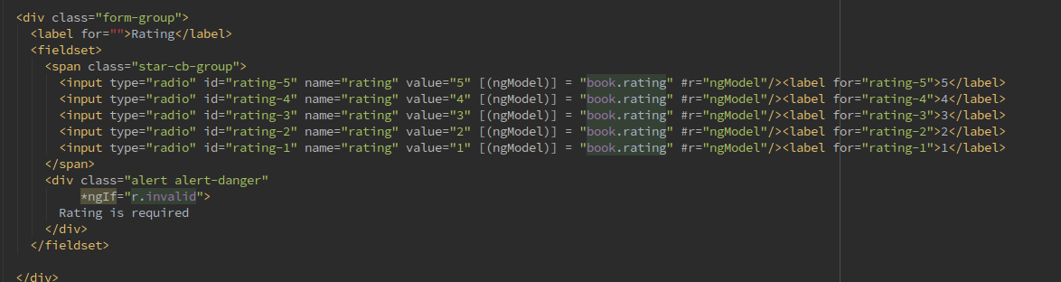 <input type="radio" id="rating-5" name="rating" [value]=book.rating [(ngModel)] = "book.rating" #r="ngModel"/><label for="rating-5">5</label>