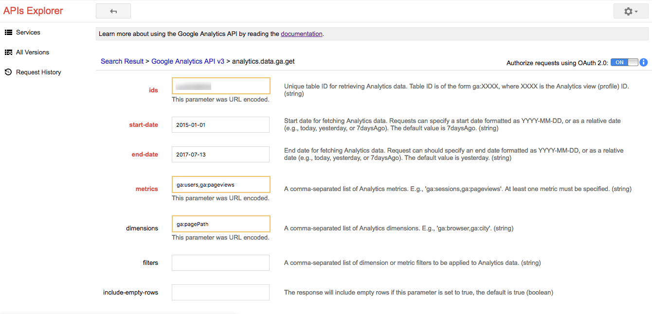 https://www.googleapis.com/analytics/v3/data/ga?ids=ga%3A62299534&start-date=2015-01-01&end-date=2017-07-13&metrics=ga%3Ausers%2Cga%3Apageviews&dimensions=ga%3ApagePath&key={YOUR_API_KEY}提前谢谢。