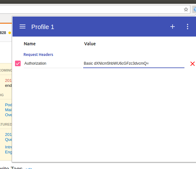 幸运的是,同样的事情也可以使用Authorization头来完成。您只需以编码形式传递凭据即可。ModHeader是为你做的。它拦截浏览器的每个请求,并在其中追加此标头。