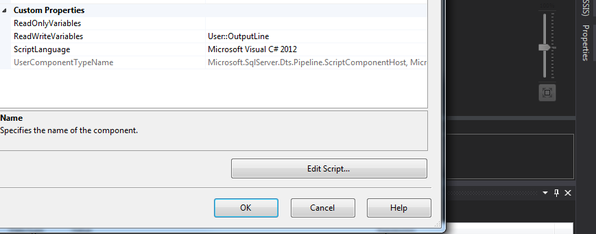 单击Edit Script按钮,有3种方法:PreExecute、PostExecute和Input0_ProcessInputRow。将以下代码行添加到PostExecute和Input0_ProcessInputRow: