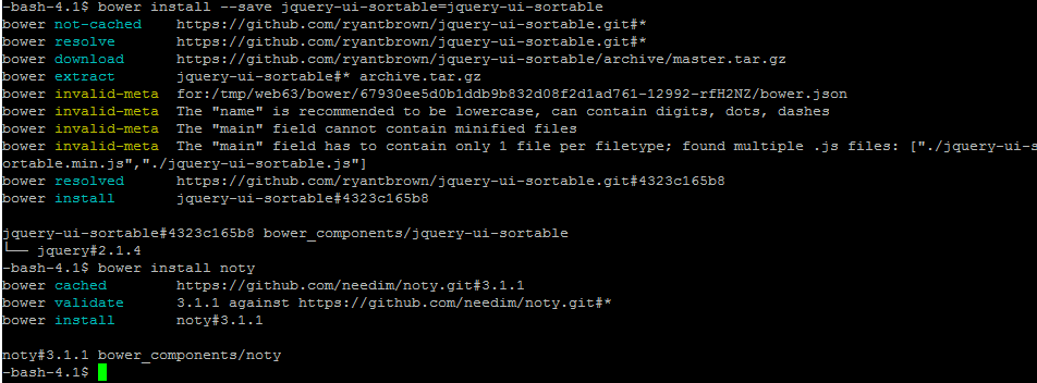 所以我是通过bower - jQuery UI Sortable安装的。包的文件夹如出一辙地放在“我的资产”文件夹中。然后,我想安装另一个软件包(例如:noty.js和bower install --save noty),我得到了以下信息: