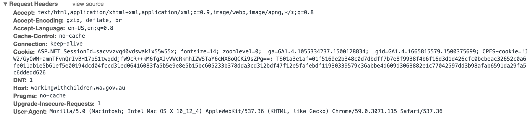 我注意到网站设置的cookie似乎与安全性和CPFS有关,我可以想象这些cookie是阻止我的客户成功解析网页的原因。但我不知道怎么解决这个问题。我想这是别人以前遇到过的问题。任何帮助都将不胜感激。
