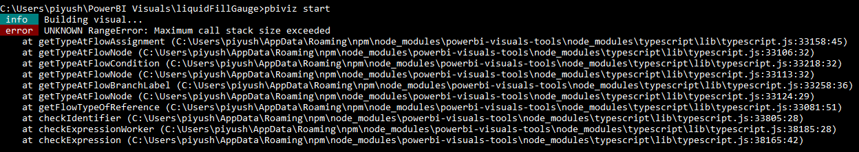 我正在尝试使用Power开发工具在Power中创建一个新的自定义可视化。我在跟踪Jon创建Power自定义可视化博客。我遵循了博客中提到的所有步骤,但是我得到了一个错误:“未知RangeError:最大调用堆栈大小超过了”。这似乎是我正在使用的javascript错误。我不知道怎么解决这个问题。