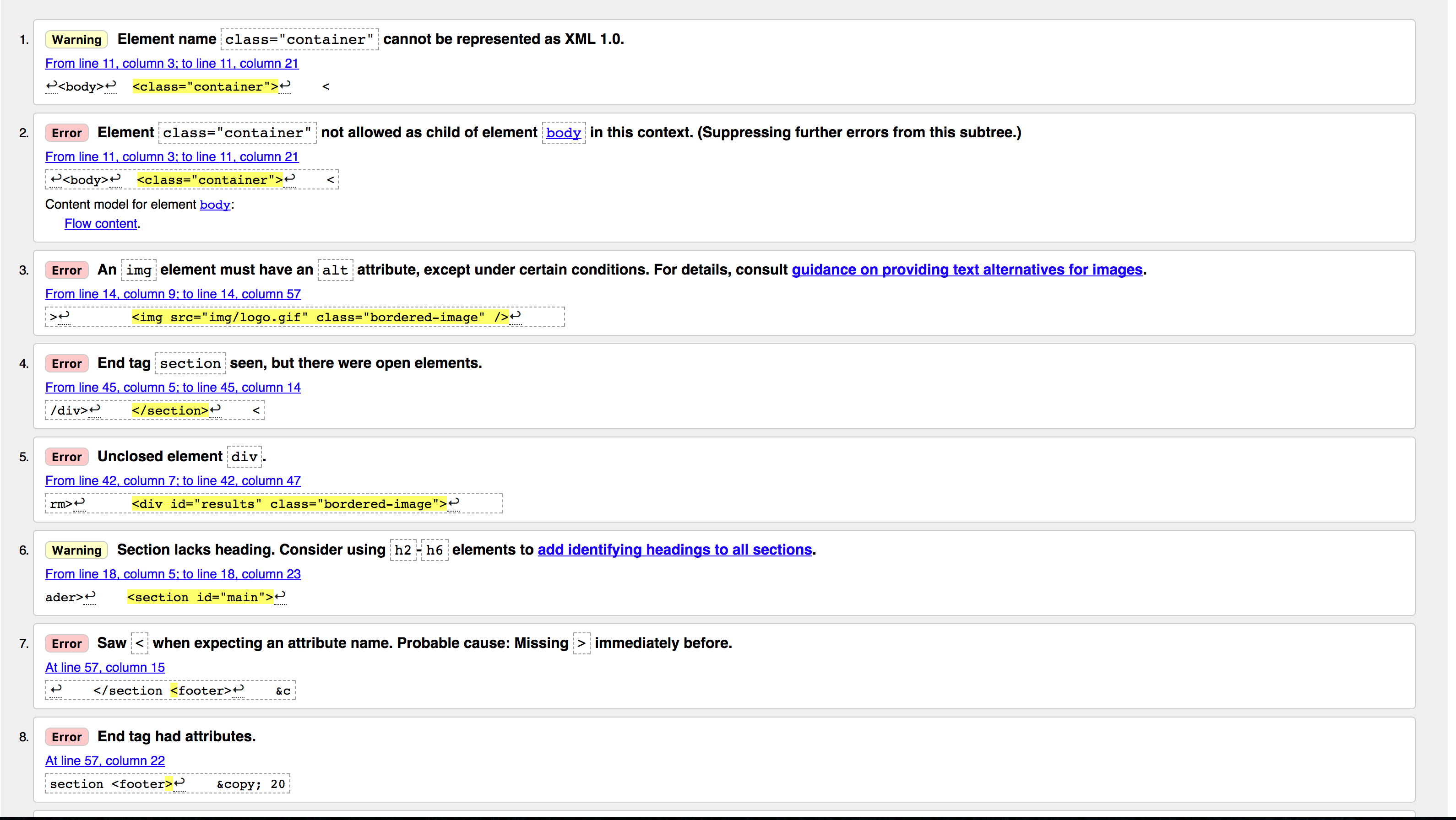 首先,无论何时编写HTML,通过W3C提供的验证器运行它,它都会指出标记中的特定错误。