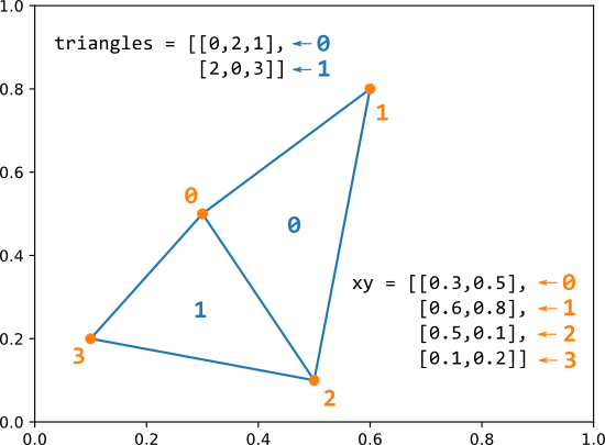考虑这段代码,其中我们有一个(4,2)数组,指定点坐标,对一行中的每个点都有x和y坐标。然后,我们从他们创建三角形,通过使用应构成三角形逆时针方式的点的因地制宜。