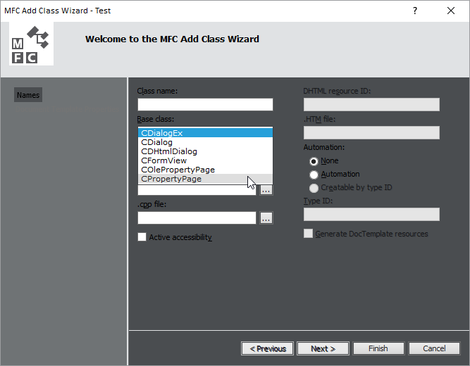 我想选择CMFCPropertyPage,但它没有显示出来。所以,只选择CPropertyPage,然后手动更改就可以了吗?