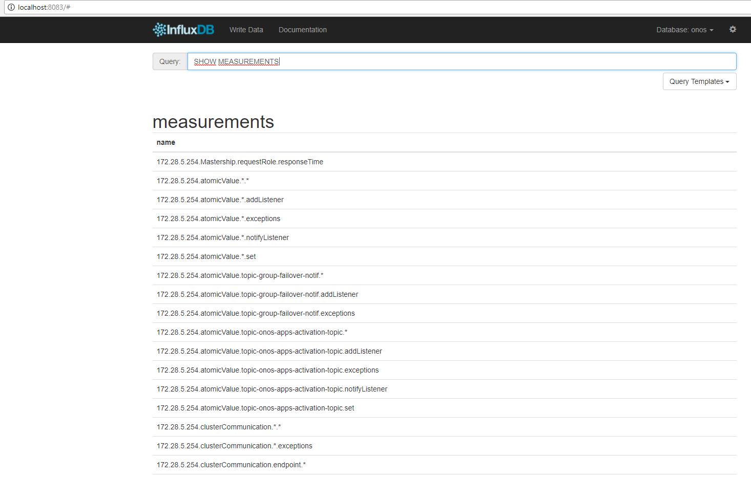 在配置完文档中的所有内容之后,我在InfluxDB中执行“显示度量”,而没有显示任何数据,因为我创建的数据库是空的,所以ONOS不会在其中发布度量标准。