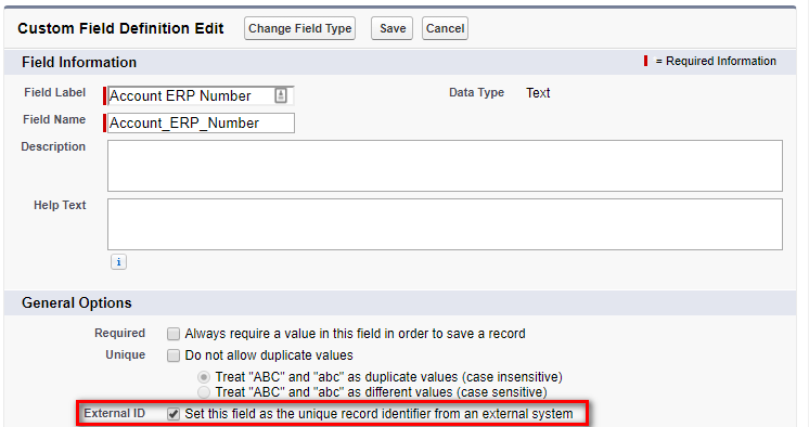 要使Upsert函数工作,您需要将其中一个字段指定为外部ID字段。这是在Salesforce中完成的,如下所示。