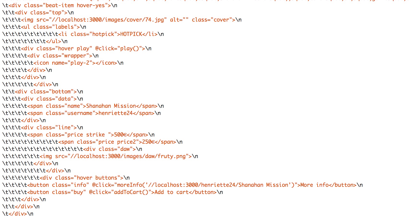 当我获得没有DomCrawler的内容时,我会得到带有诸如@click这样的自定义标记的html,但是当我使用$this->crawler->filter('something')->html()时,DomCrawler正在删除我的@click标记。
