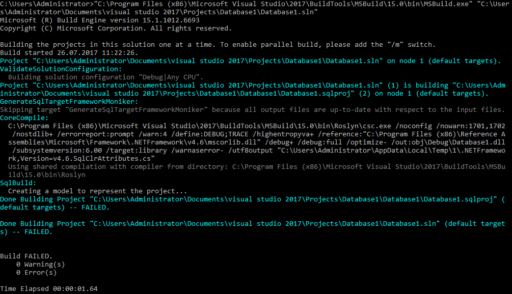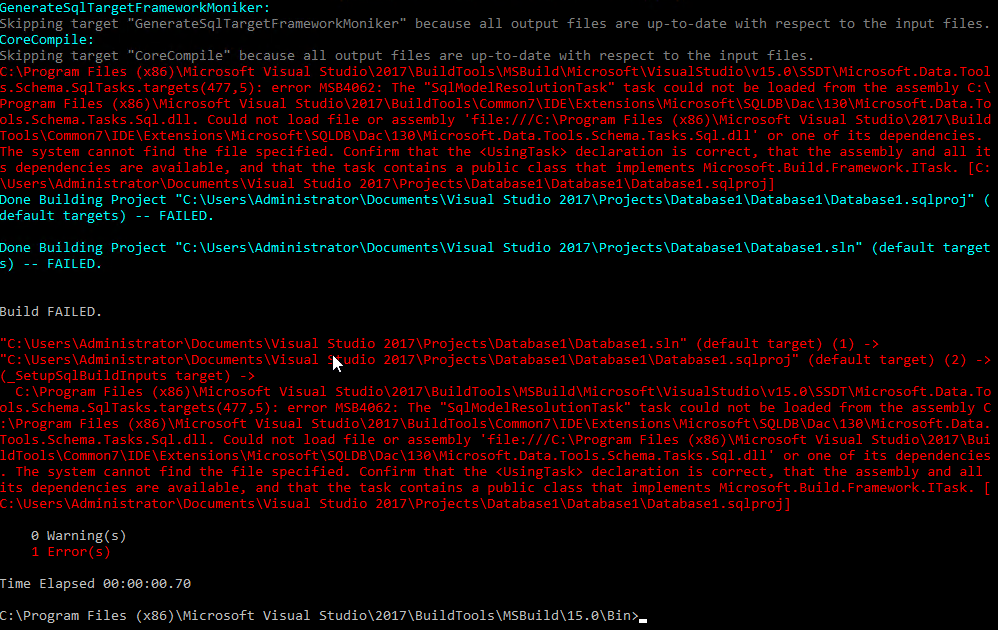 这一切都是从TC中的VS2017运行程序类型开始的。它失败了,没有任何错误或提示(除了解决方案级别的(default targets) -- FAILED.消息)。我把范围缩小到了。这些不是通过MSBuild构建的,它们确实在构建代理上的VS2017中完美地编译。我在责怪SSDT .但我想我检查了所有的东西。这是TC构建中出现的直到解决方案级别的问题: