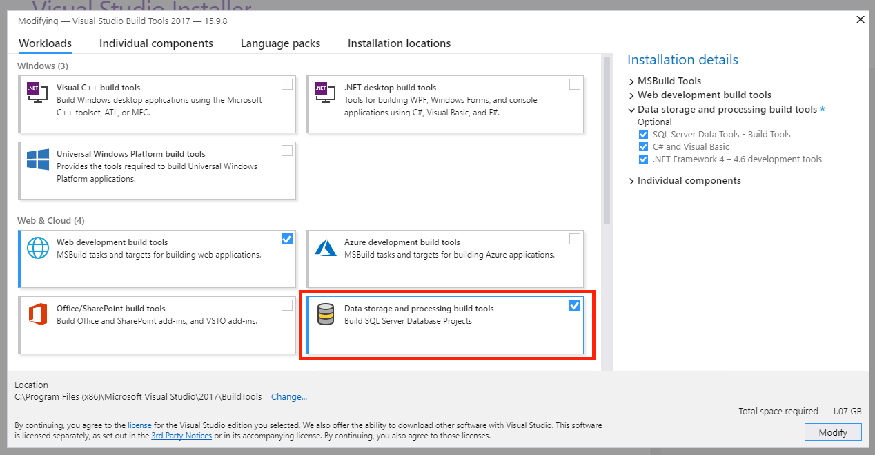 原因是:在构建工具及其版本的MSBuild中缺少SSDT。