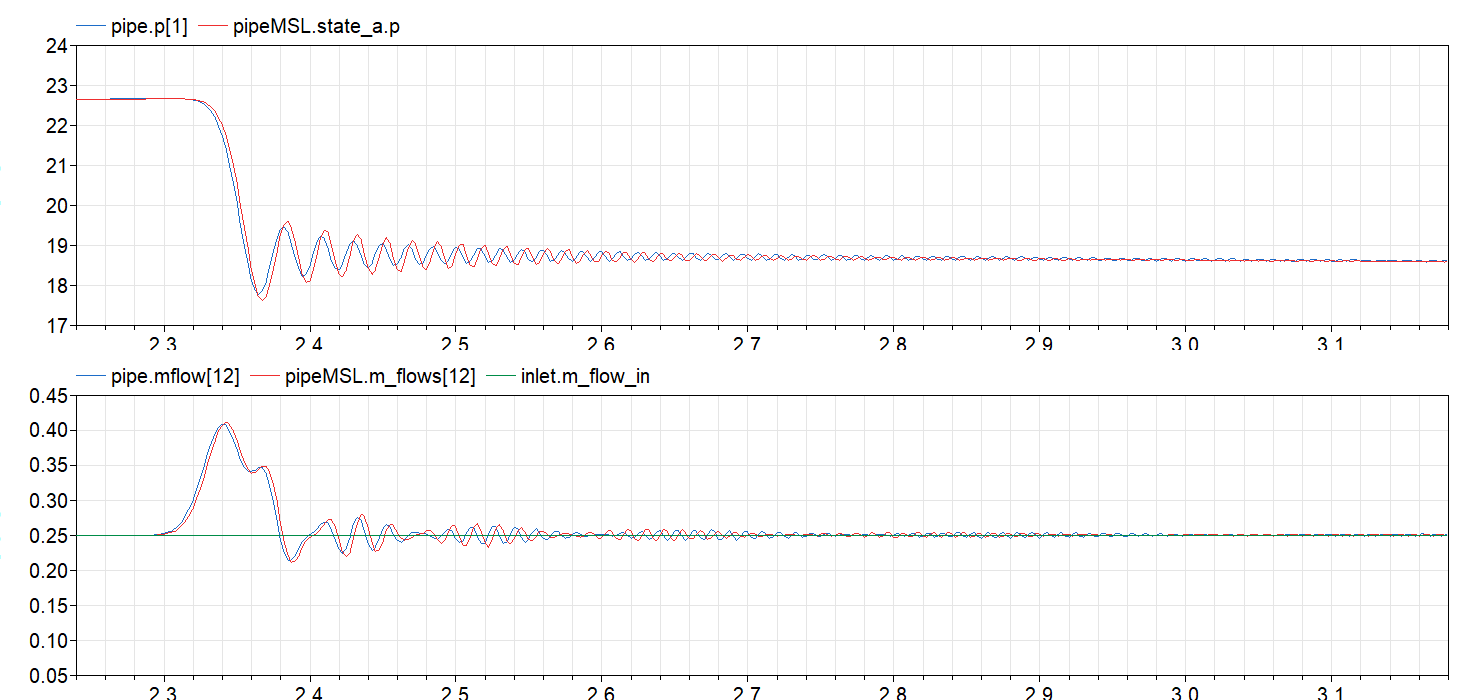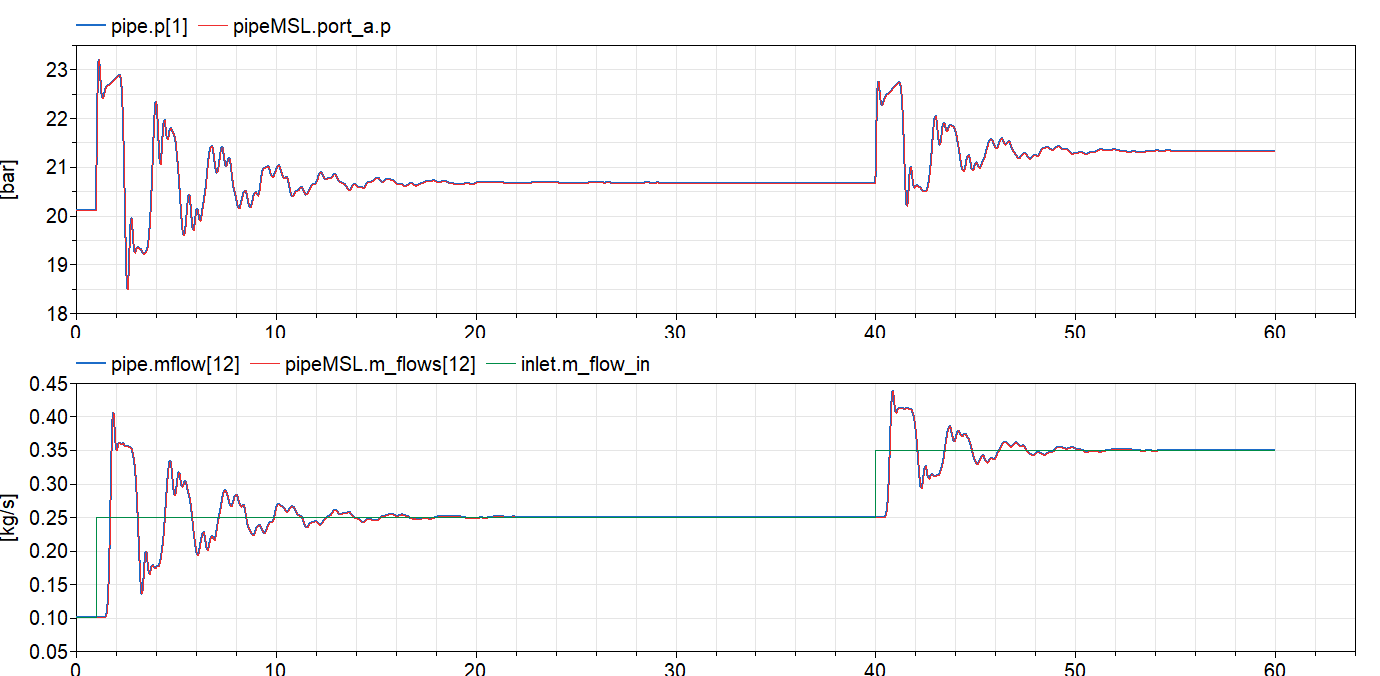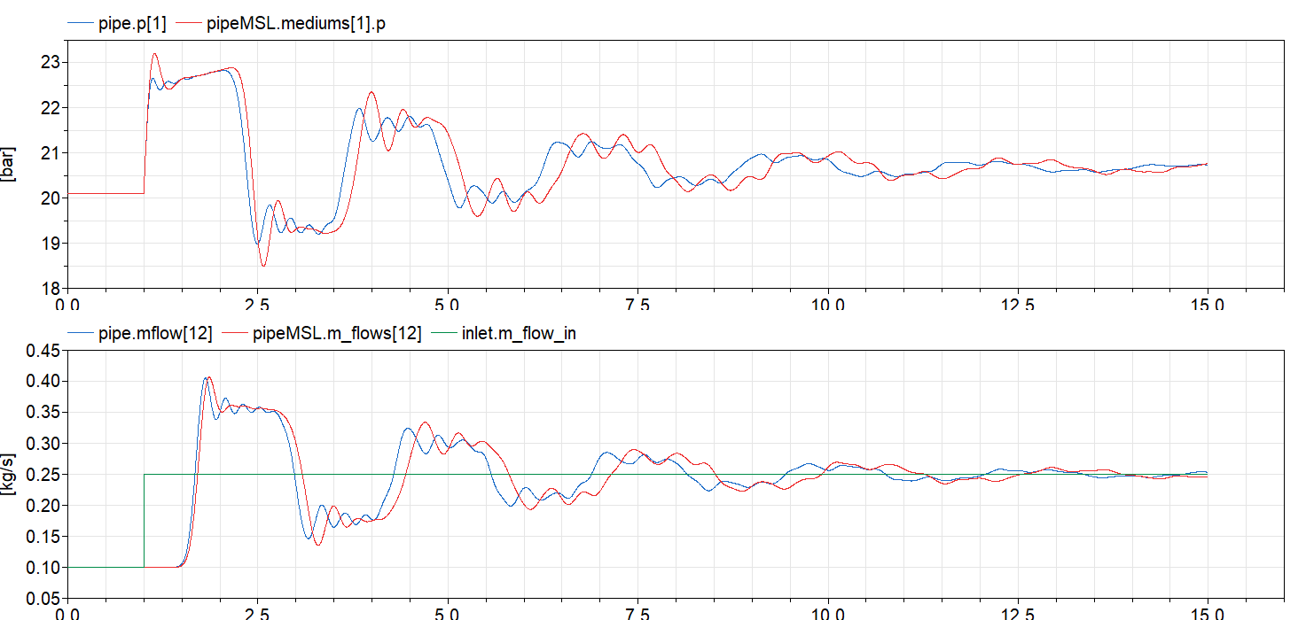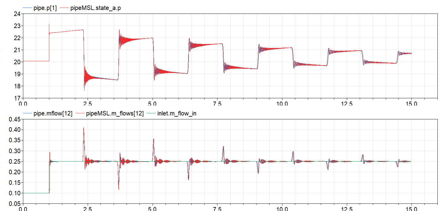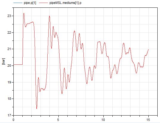 作为测试用例,我使用了一个带有台阶信号的质量流源(水锤)。我的模型给出的结果与Modelica.Fluid组件不同。我真的很感激,如果有人能帮助我,了解发生了什么!