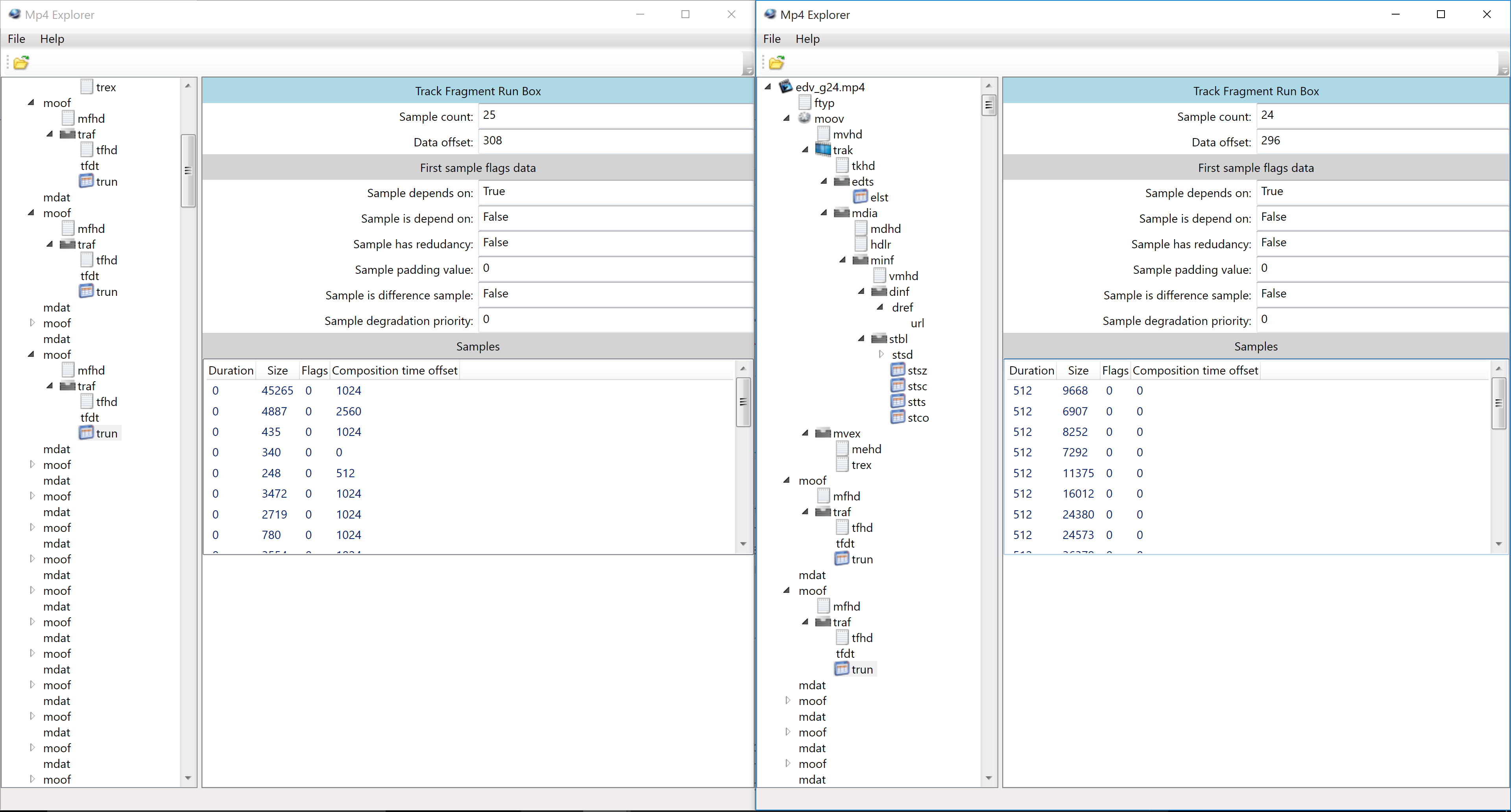 mp4fragment out1.mp4 --fragment-duration 1000 --track 'video' output.mp4使用MP4 Explorer软件,我注意到在生成的.mp4文件中,对于所有moof.traf.trun,示例持续时间被设置为,但是在Track片段标题框中,它将default_sample_duration设置为512。在另一个工作良好的.mp4文件中,没有default_sample_duration字段,但是每个样本的持续时间为512。看来这可能会引起问题。右边的图显示了工作的mp4,左边的是我生成的mp4。
